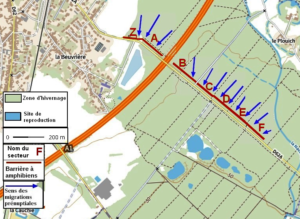 L'année dernière en cours d’opération suite à des alertes sur des amphibiens écrasés, et après avoir constaté 18 cadavres un même matin à 6h30 sur environ 80 mètres avant le secteur A, nous avions créé et aménagé un secteur supplémentaire entre le panneau de sortie de Phalempin, et le début du secteur A.
